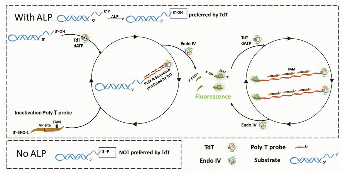除突变基因外,常见的生物标志物还包括蛋白质分子,其中,碱性磷酸酶(ALP)的异常表达与肝脏功能障碍、糖尿病等多种疾病有关,是一种良好有效的病理诊断生物标志物。李博士联合华中科技大学同济医学院药学院吴曈勃副教授团队,利用末端转移酶的延伸性质与核酸内切酶IV的AP位点切割特性,构建了一种新的指数放大荧光检测体系,实现了高灵敏度、低实验周期的ALP检测。本研究在人体血清或细胞裂解液中ALP活性评价等生物医学方面有广阔的应用空间。