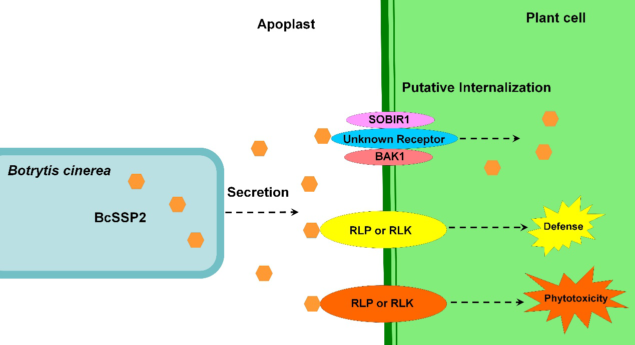 该团队在灰葡萄孢侵染时期的分泌蛋白组中筛选到1个小分子分泌蛋白BcSSP2。进一步研究发现BcSSP2基因表达量在灰葡萄孢侵染后期显著上升,表明其主要在灰葡萄孢侵染后期的病斑扩展阶段发挥重要作用,是一个新的弱毒活性蛋白。BcSSP2在灰葡萄孢与寄主植物的互作过程中,尤其在侵染后期的病斑扩展阶段起着重要作用,并极有可能在质外体中与植物受体蛋白或抗病相关蛋白识别结合,从而引起植物的褪绿/坏死并参与调控植物的抗病反应。该研究系统阐明了灰葡萄孢分泌蛋白BcSSP2在病原菌与植物互作过程中的功能机理,不仅可以为灰霉病害的防治提供理论依据,也可为其他农作物病害的抗病育种提供新的抗病基因资源。