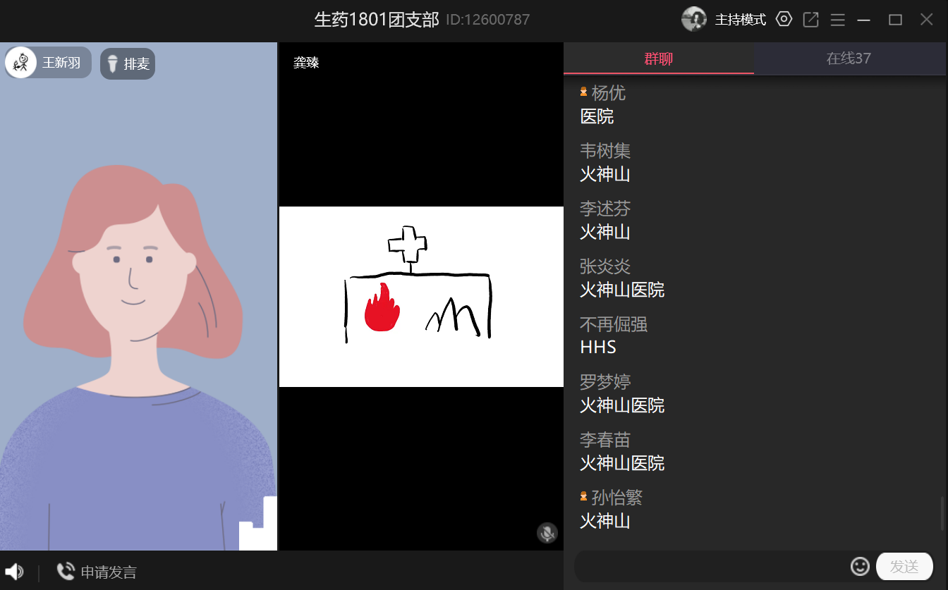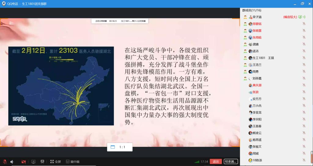 活动开始,各团支部利用央视新闻、共青团中央等权威平台积极组织开展线上疫情防控专题学习宣传活动,共同学习“全国大学生同上一堂疫情防控思政大课”,提升科学素养和人文情怀,准确解读防控信息,并撰写学习心得体会。随之,在组织开展线上疫情防控主题交流和榜样分享活动中,支部团员分享了自己身边的抗疫故事。此外,在开展网络文化成果征集和分享工作,创新宣传方式,激发共克时艰的正能量这一专题上,生工学子创新十足,支部成员通过视、音、画等多种宣传方式,除采用微团课、小视频剪辑、书法、绘画、文字等多种文化艺术途径来抒发爱国情外,更是有一些特殊的开展形式让团日活动变得更加鲜活,生药1801团支部利用“你画我猜”互动小游戏,现场互动,将画与思考抗疫期间的相关意象联系起来,互动中引发广大青年团员对于疫情期间的深思,支部内团员陈琴说:“当代青年应在大写的青春谱写大写的青春梦想!”。