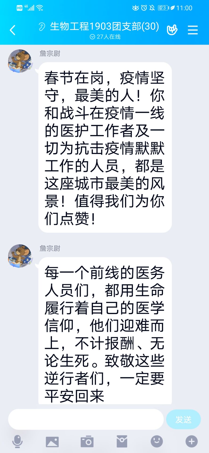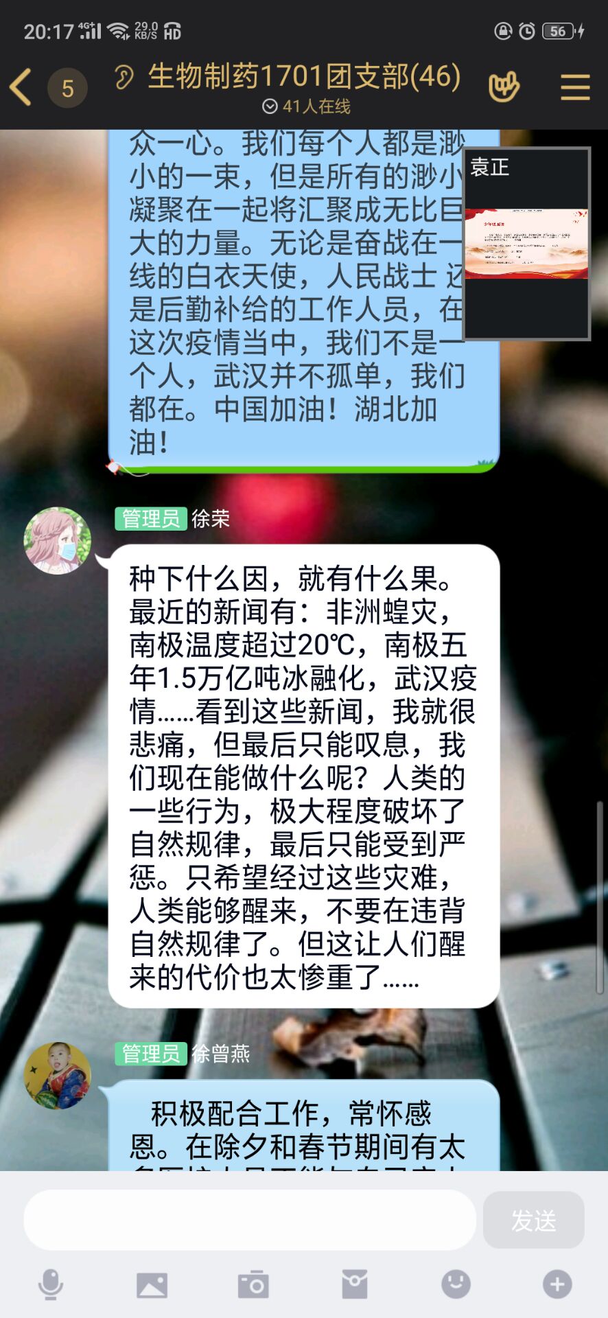 2020年3月17日至21日,yh533388银河生物与制药工程学院全体团支部为贯彻落实习近平总书记关于打赢疫情防控阻击战重要指示精神,增强全体团员青年疫情防控意识,强化疫情抗击责任,充分发挥青年学子在疫情防控中的先锋作用,在校团委的指导下,开展了“共抗疫情,爱国力行”线上特别主题团日活动。
