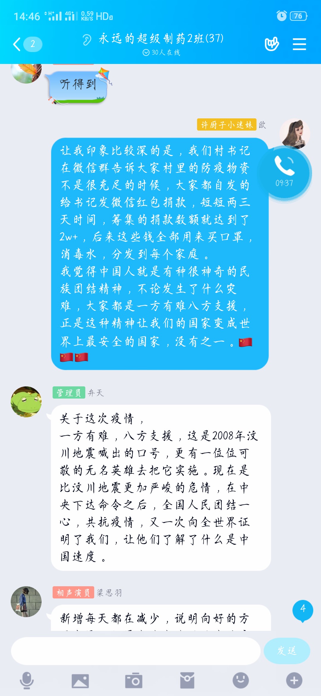 线上共诵爱国情,线下抗疫我先行。在我院青年志愿者协会积极组织下,生工学子报名踊跃“你为大家战一线,我助小家育花开”大学生线上爱心助学专项行动或其他线上疫情防控志愿服务活动上,有的同学为身处武汉的小朋友进行一对一线上辅导,有的同学早已投身于家乡的抗疫志愿工作中,发扬轻工大学子的奉献精神。生科1802团支部团支书张阳同学作为社区的网络志愿者的一员,分享道:“疫情期间的线上志愿活动,让我深刻体会到了作为当代青年学子内心的拳拳爱国之情以及为国贡献的强烈愿望,我作为大学生志愿者之一,感到非常自豪!”。