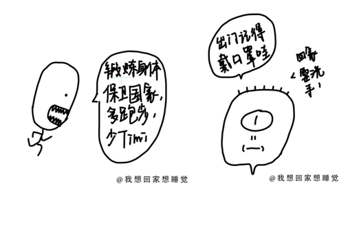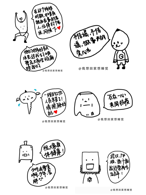 由我院生物专业学生党支部学生张恬静创作的漫画作品围绕“致敬医护人员”和“疫情防护”两个主题,通过“武汉加油,热干面我还要再吃五百年”、“一线的医护人员辛苦了”、“万众一心,共同抗疫”等朴实感人的文字点睛,致敬城市英雄。同时,通过该种形式普及防疫常识,如锻炼身体少TIMI,出门记得戴口罩等。