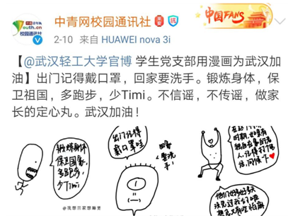 中国青年网2月10日讯,“学生党支部用漫画为武汉加油”,面对疫情,我院生物专业学生党支部第一时间开展艺术战“疫”创作,用漫画作品传递正确防护方法,致敬城市最美逆行者。