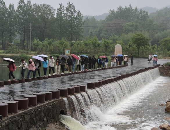 下高速之后意外遇见碰上了公路建设,为了尽早到达目的地我们选择了步行,途中下起了濛濛细雨,和同学同披一件雨衣在雨中赶路,是久违的共同前行的感觉,一起踩着石墩子过桥,在雨中踩出一朵朵水花。
