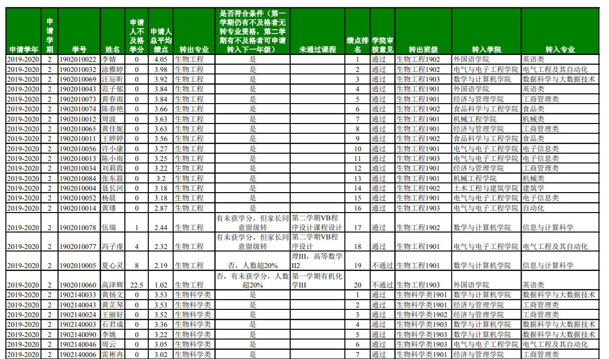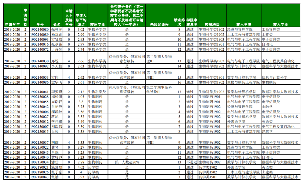 为确保2019级本科生转专业工作公开、公平、公正、择优完成,现将2019级本科生转专业学院审核结果公示如下: