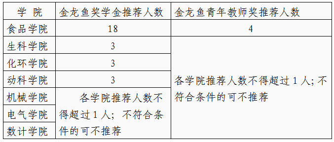 (二)金龙鱼青年教师奖:食品科学与工程学院、生物与制药工程学院、化学与环境工程学院、动物科学与营养工程学院、机械工程学院、电气与电子工程学院、数学与计算机学院从事粮油、食品、生物、化学相关研究的青年教师,年龄不大于45周岁。其中粮油、食品相关研究具体内容同上。