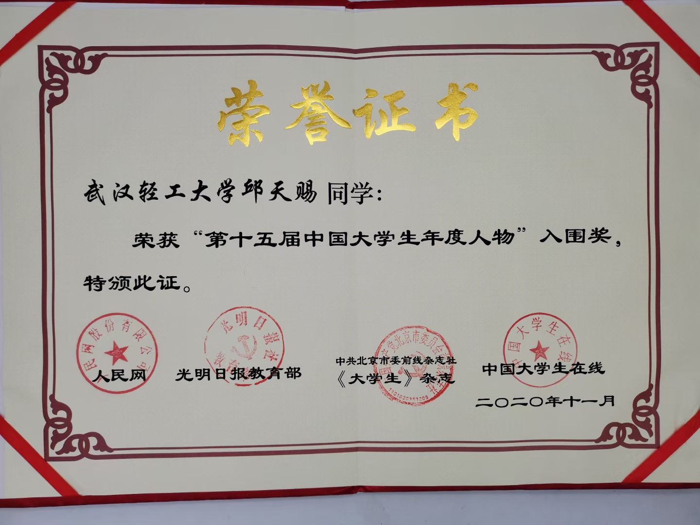 近日,由教育部、人民日报社共同指导,人民网、光明日报教育部、《大学生》杂志和中国大学生在线联合主办的“第十五届中国大学生年度人物”评选结果揭晓,我校邱天赐同学荣获第十五届“中国大学生年度人物”。