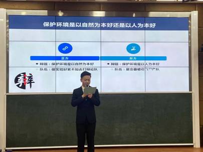 参加课程学习的学生自行分组,针对《保护环境是以自然为本好还是以人为本好》、《减少温室气体的排放会促进/减慢国家发展》等关于环境生态与发展的热门辩题持证辩论,氛围激情热烈。《环境经济学》课堂形式创新,学生参与度极高,积极推动学生从被动学习到主动学习,真正实现了课程从知识、技能到情意的三级目标。辩论会中场休息期间,王丽梅老师与参加辩论的学生辩手沟通讨论,学生落落大方地反馈了对参与课程的收获和真实感悟,表现出对课程的浓厚兴趣和课堂形式的喜爱。