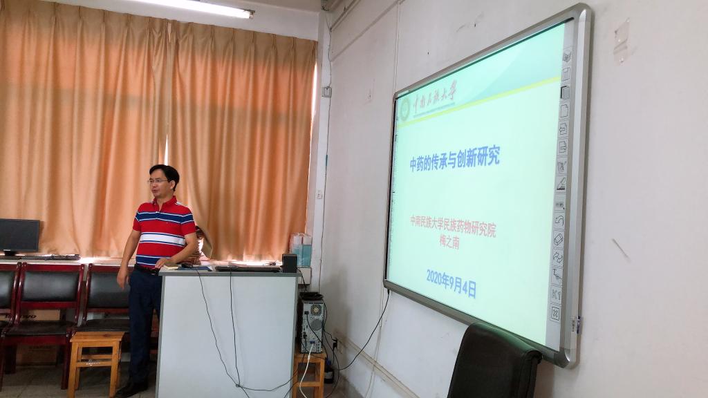 座谈会上梅之南教授从中医药深厚的历史渊源引入,以传统中医药寻求变革与突破的探索历程做了《中药的传承与创新研究》学术报告。报告中,梅教授从药用植物资源学与中药质量研究、中药药效物质基础研究、中医药现代化、新产品开发等研究领域入手,系统介绍了中南民族大学民族药物研究院相关研究成果。