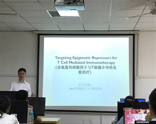 5月23日,受生物与制药工程学院的邀请,美国国立卫生研究院彭冬君博士到访该院,并面向师生做了“T细胞介导的肿瘤免疫治疗中的靶向性表观遗传抑制机制”的精彩报告。会议由刘志国院长主持。