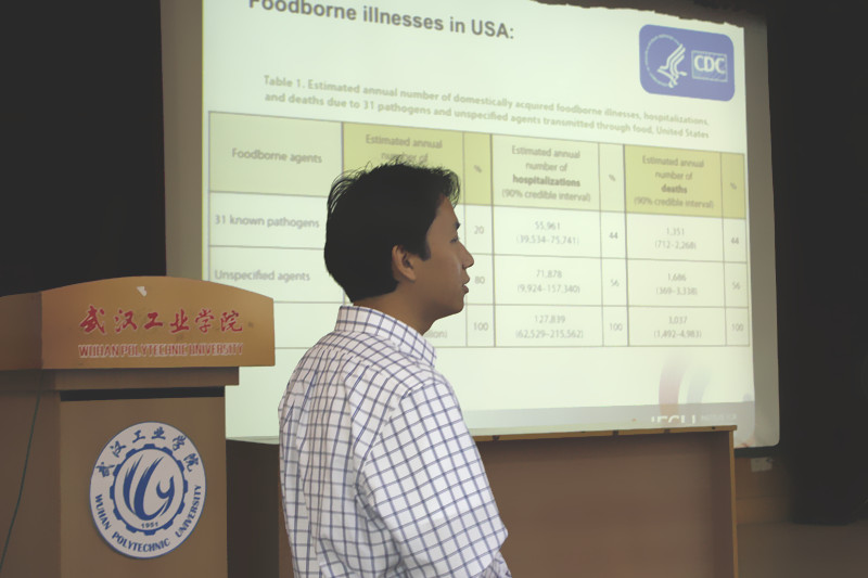报告会开始后,我生工学院副院长胡申才副教授介绍了张为博士的求学经历、研究领域以及科学成果。张博士现就职于美国食品药品管理局与伊利诺伊理工大学合办的食品与健康研究所,任食品微生物学副教授兼首席科学家。在短短几年的研究时间里,他已取得了丰硕的研究成果,科研论文已发表于Genome research和PNAS等多个权威杂志上,并被Nature,Annual Review of Microbiology,PNAS等多家杂志引用(论文共被他引300次以上)。