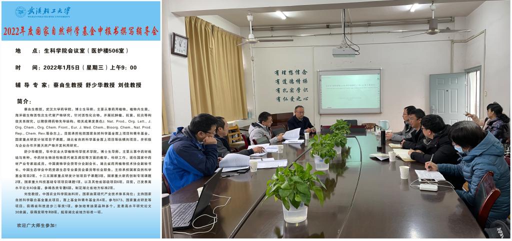 1月5日上午,我院在学院506会议室举行2022年度国家自然科学基金申请书撰写辅导会。会议邀请武汉大学蔡由生教授,华中农业大学舒少华教授和中国农科院油料所刘佳研究员对我院青年教师2022年度国家自然科学基金申请书的撰写进行了系统的辅导。会议由学院副院长杨江科教授主持,副院长陈新教授和我院广大青年教师参加了会议。