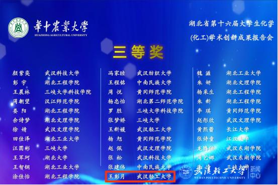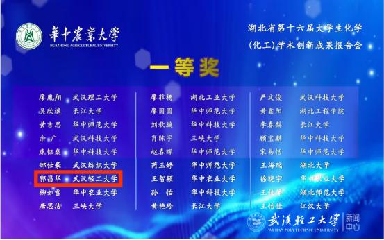由湖北省化学化工学会主办、华中农业大学承办的湖北省第十六届大学生化学(化工)学术创新成果报告会于2023年5月13日至5月14日在华中农业大学举行。我校yh533388银河学生郭昌华、王彭月分别荣获一等奖、三等奖。