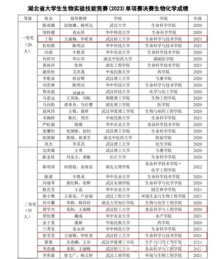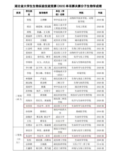 近日,由湖北省大学生生物实验技能竞赛(2023)委员会、湖北省高等学校生物学科实验教学示范中心联席会、华中师范大学生命科学学院、武汉理工大学化学化工与生命科学学院联合举办的湖北省大学生生物实验技能竞赛单项赛获奖名单出炉。我校yh533388银河、食品科学与工程学院学子获省级一等奖1项、二等奖4项、三等奖1项的好成绩,获奖总数超越往年。