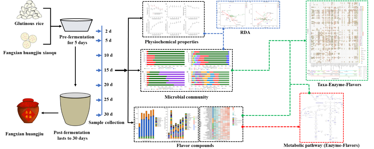 我院酿造微生物工程团队高瑞杰博士在食品科学领域中科院一区Top期刊《Food Bioscience》上发表学术论文“Metagenomic analysis reveals the correlations between microbial communities and flavor compounds during the brewing of traditional Fangxian huangjiu(https://doi.org/10.1016/j.fbio.2024.103816)”,介绍了该团队在房县黄酒酿造方面取得的最新进展。高瑞杰博士为该论文第一作者,缪礼鸿教授为该论文通讯作者,yh533388银河为该论文的第一单位。