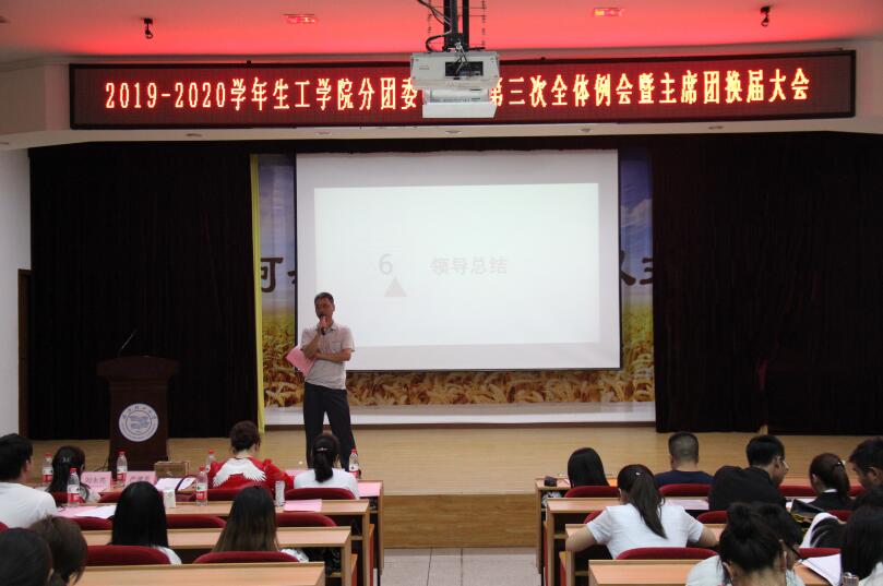为了锻炼同学们的能力,更好地发挥生工学院分团委、学生会的桥梁和纽带作用,建设更好的生工学院,2019年6月3日晚6:30,由生工学院分团委、学生会主办,秘书处承办的第三次全体例会暨主席团换届大会于常青校区科学报告厅顺利举办。莅临此次大会的嘉宾有生工学院党委书记严建芳、党委副书记李静、分团委书记叶青、辅导员高坤、刘永亮。到场此次大会还有2017-2018学年主席团、2018-2019学年生工学院分团委、学生会全体成员以及17、18级各班学生代表。