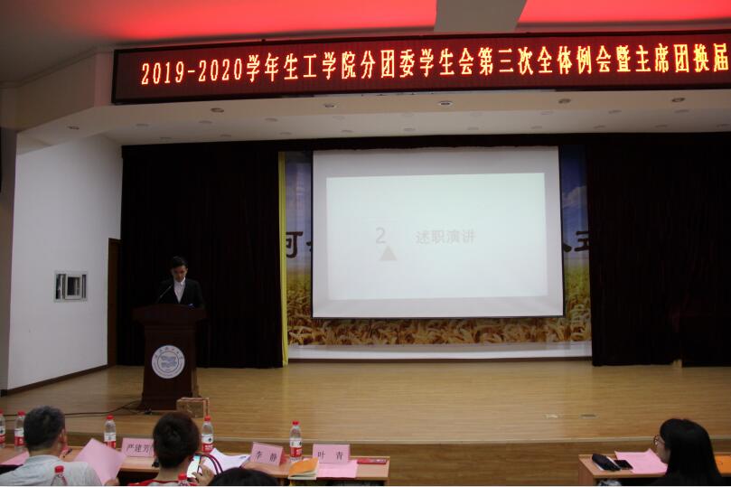 大会伊始,先由2018-2019学年学生会主席张镱代表生工学院分团委、学生会作述职报告,从组织建设、多彩活动、基础服务工作和改革创新四个方面总结了生工学院这一年来取得的优秀成绩和部门构建调整与优化。组织建设是根基,多彩活动锻造文化舞台,暑期实践活动取得闪耀成就,改革创新永远在路上。分团委、学生会的进步离不开每个人的努力与付出,生工学院的明天更美好。