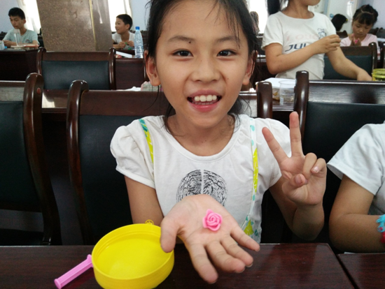 (胡微娜展示自己用橡皮泥制作的花)