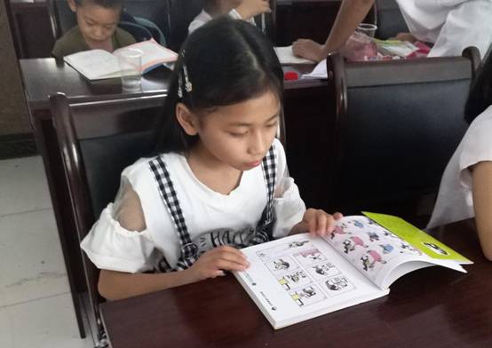 (胡微娜正认真地看着在阅读室中挑选的课外书)