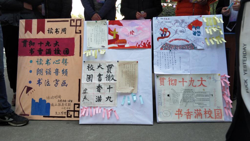 为了丰富大学生的课外生活,2017年12月25日中午11:30生工学院学生会学研部与文宣部在常青公寓门口举行了“贯彻十九大 书香满校园”读书周活动书法字画板块的外场作品展示活动。