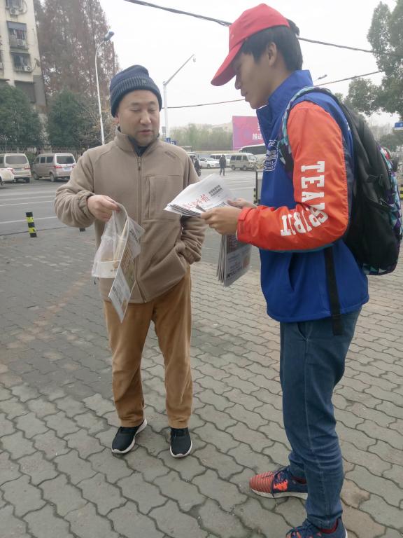 早上七点半,天蒙蒙亮,初冬的早晨略带凉意,志愿者们带着饱满的热情 ,踏着匆匆的步伐前往阳光雨露广场集合,一张张笑脸仿佛驱散了寒冷,温暖了周围的人。志愿者们在穿上志愿者服,戴上小红帽,领取了报纸之后,便兵分几路,分别在地铁站、北门菜市场、各商场附近等人流量较大的地方井然有序地开展活动。