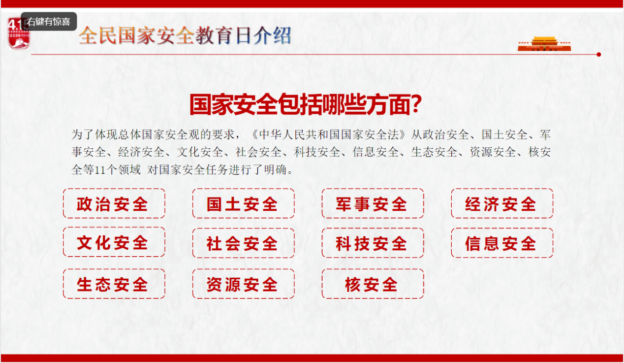 此外,会议中各班负责人带领同学们学习了《中华人民共和国国家安全法》和《中华人民共和国反间谍法》,用案例重点讲解了危害国家安全的五种行为。通过班会学习,使同学们明确了哪些行为不可做,哪些行为违法,哪些行为危害国家安全,提醒了同学们在面对外界的诱惑和敌对势力渗透时,一定要提高警惕,明辨是非,坚定立场,坚决抵制敌对势力在意识形态领域的渗透。