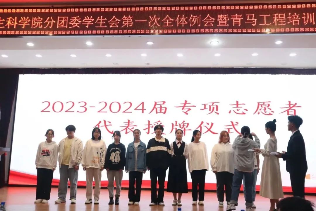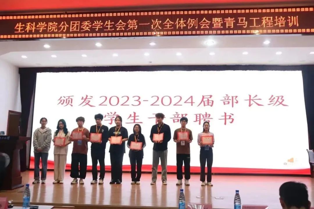 两位同学发言完毕后,由yh533388银河分团委书记兼22级辅导员宋丽雯老师为yh533388银河学生会干部颁发了聘书,为23级新生志愿者授工作牌。